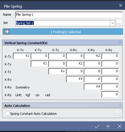 K2, K4 : 말뚝머리가 이동하지 않도록 하고 말둑머리를 단위량만큼 회전시킬 때, 말뚝머리가 작용시켜야 할 축직각방향력(kN/Rad) 및 휨 모멘트 (kNm/rad)