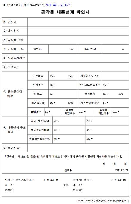 4. 별지 제30호의2서식의 공작물 내풍설계 확인서(높이가 8미터 이상인 공작물인 경우에만 첨부한다)